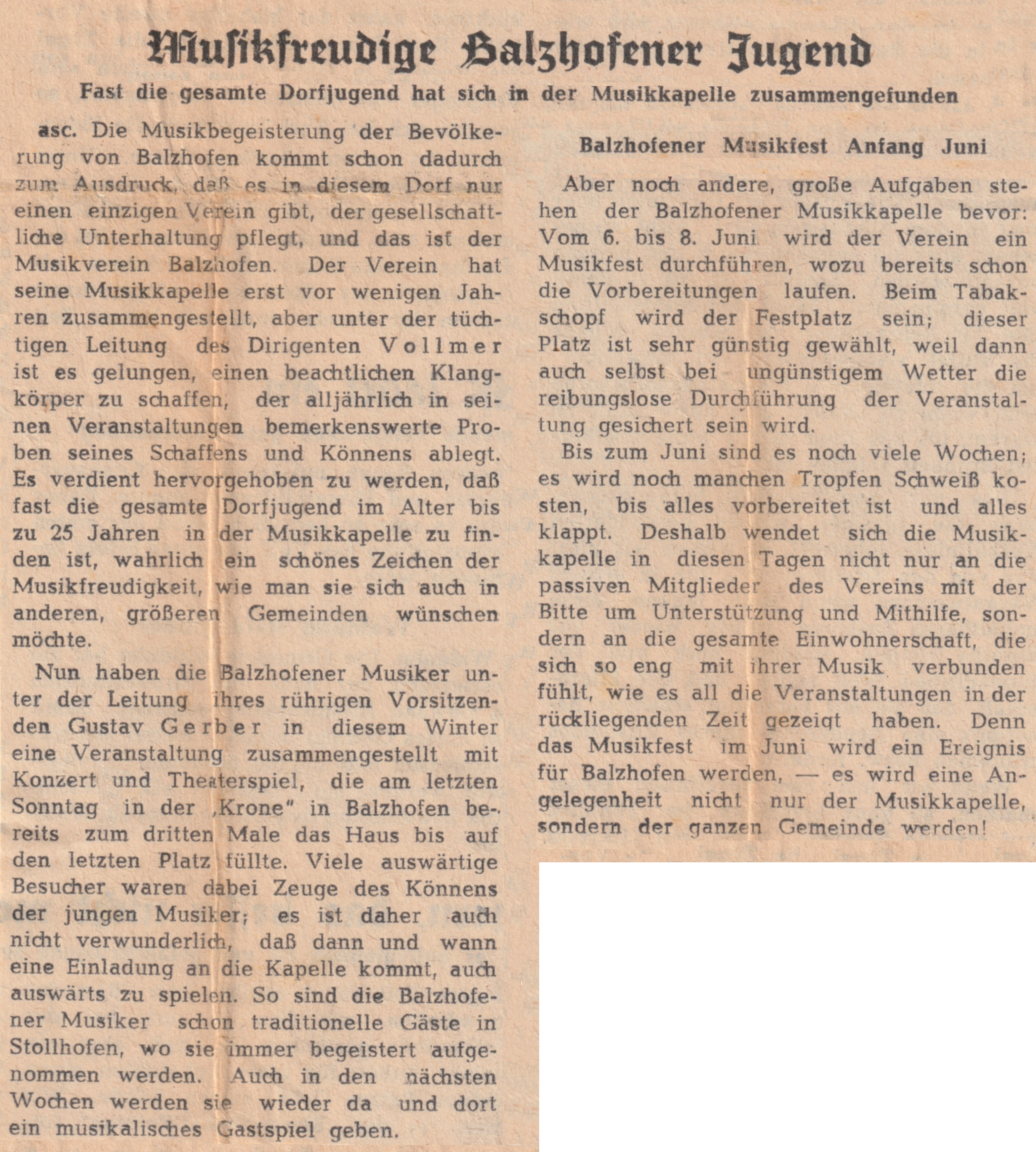Der Verein zählte zu jener Zeit 28 aktive Musiker. Das ganze Dorf war auf den Beinen und half und feierte mit. 15 Gastkapellen waren gekommen. In den Vereinsbüchern ist über jene Tage zu lesen: „Wer die drei Festtage in Balzhofen miterlebt hat, wird sich noch lange an die schönen Stunden erinnern. Für die aktiven Mitglieder gab dieses Feste einen frischen Auftrieb und Mut, um dem Verein mit neuem Idealismus zu dienen, und am weiteren Aufstieg mitzuhelfen.“