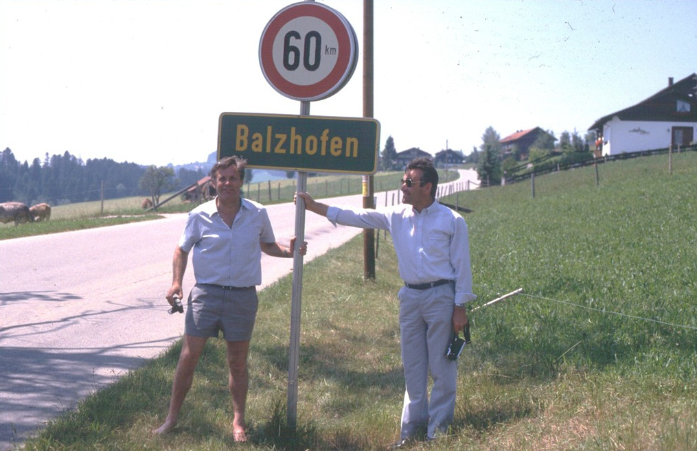 Im Jahr 1986 nahm der Musikverein „Harmonie“ Balzhofen erstmals Kontakt auf mit Balzhofen im Allgäu, einem Ortsteil von Stiefenhofen bei Oberstaufen. Auf dem Bild sind Stefan Reith (Dirigent) und das damalige Vorstandmitglied Franz-Josef Braun am Ortseingang von Balzhofen zu sehen. Trotz eines gelungenen Ausfluges zu den Balzhofenern im Allgäu entwickelte sich hieraus jedoch keine dauerhafte Verbindung.