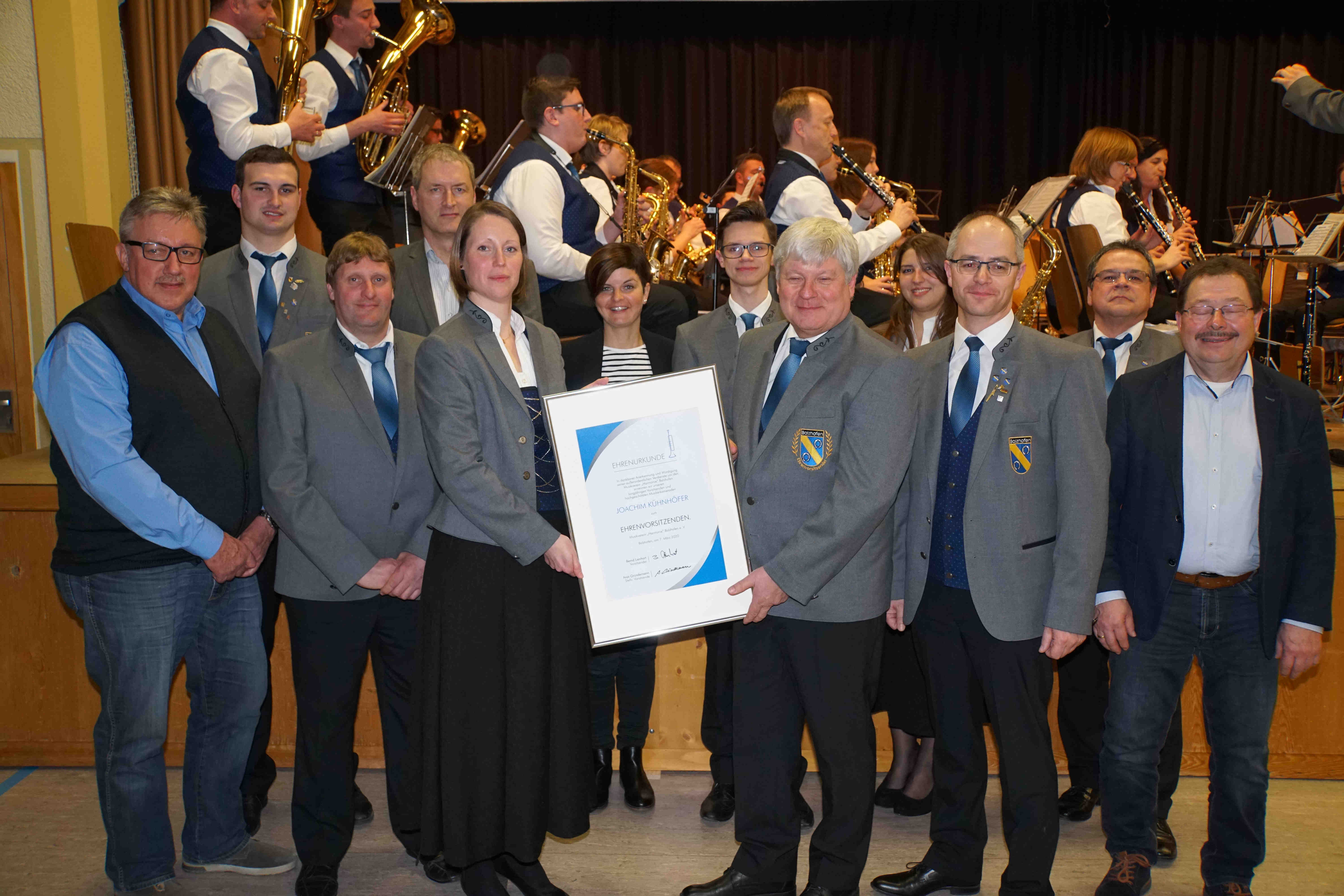 In mehrfacher Hinsicht stellte das Jahr 2020 für den Balzhofener Musikverein eine Zäsur dar. Es begann mit einer denkwürdigen Mitgliederversammlung. Erstmals in der Vereinsgeschichte wurde mit Edmund Hensel ein aktives Mitglied für 70-jähriges Musizieren mit dem Ehrenbrief und der BDMV-Ehrennadel in Gold mit Diamant ausgezeichnet. Der Vorsitzende Joachim Kühnhöfer zog sich nach zwölf Jahren als Vorsitzender von seinem Amt zurück. Zu seinem Nachfolger wählte die Versammlung Bernd Lienhart. In Würdigung Joachim Kühnhöfers herausragender Verdienste zeichnete der neu gewählte Vorsitzende diesen als erste Amtshandlung mit dem zum dritten Mal in der Vereinsgeschichte verliehenen Ehrenvorsitz aus.